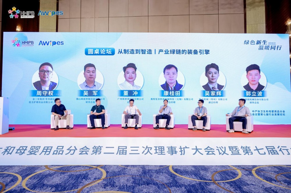 Zhou Shouquan, executive vice-president van Jinsanfa Group en algemeen directeur van Youquan Care Products Co., Ltd., zat de themabespreking voor: "Van productie naar intelligente productie丨Equipment Engine van de industriële groene keten". Kang Guitian, algemeen directeur van Autofa Nonwovens Machinery Technology (Wuxi) Co., Ltd., Dong Chong, algemeen directeur van Guangzhou Spley Technology Co., Ltd., Guo Libo, verkoopdirecteur van Zhengzhou Zhilian Machinery and Equipment Co., Ltd., Wu Jun, verkoopdirecteur van Foshan Fengyi Intelligent Equipment Co., Ltd., Wu Jiahui, plaatsvervangend algemeen directeur van Lufeng Machinery (Zhengzhou) Co., Ltd., en anderen vertegenwoordigers op het gebied van speciale apparatuur in de hygiëne- en moeder- en babyproductenindustrie deelden de gratis schakeltechnologie van vochtige doekjes, de hele lijn van zachte handdoeken, intelligente productie en technische diensten, onbemande productielijnen en een laag gramgewicht. De nieuwste ontwikkelingen op het gebied van brede, fijne en snelle heteluchtproductielijnen.